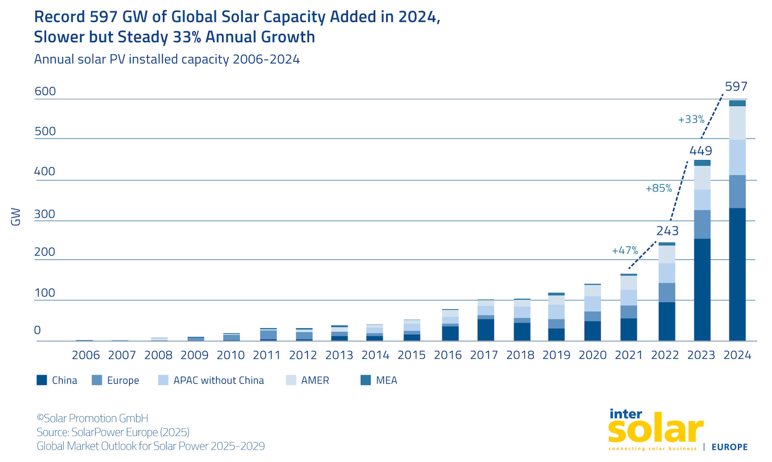 Así que el mercado fotovoltaico mundial se está moviendo. Con una capacidad instalada de alrededor de 95 GW y un crecimiento anual del 72 por ciento, China se encuentra a la cabeza de los mercados mundiales, seguida de EE. UU. (21,9 GW), India (17,4 GW) y Brasil (10,9 GW). El mercado europeo está liderado por España (8,4 GW), Alemania (7,4 GW), Polonia (4,5 GW) y Holanda (4,1 GW). En comparación con el mercado global, Europa sigue teniendo el mayor número de instalaciones per cápita. Y las perspectivas para el despliegue solar en Europa siguen siendo prometedoras: con planes políticos para desarrollar aún más la seguridad energética, incluidos nuevos marcos regulatorios, se ha establecido otra piedra angular para impulsar un mundo de energía renovable, descentralizado y digital en Europa.