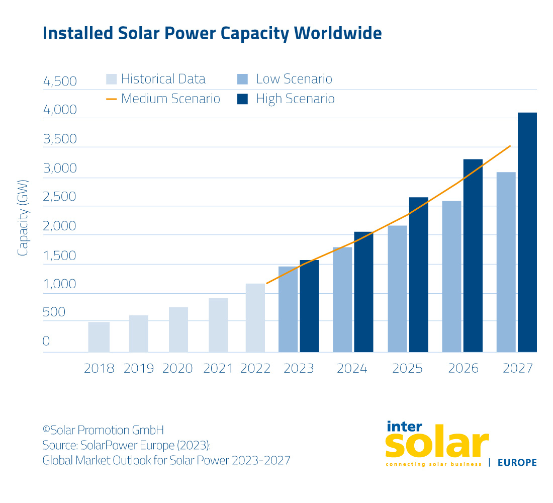 Múnich/Pforzheim, 27 de julio de 2023: la industria solar global está lista para una revolución, con todas las señales que apuntan al crecimiento. Recientemente, en la Intersolar Europe Conference 2023, la asociación industrial europea SolarPower Europe presentó la última edición de su Global Market Outlook for Solar Power 2023–2027 . El estudio de mercado muestra que en 2022, el mercado fotovoltaico mundial alcanzó un nuevo récord de crecimiento con un despliegue de 239 gigavatios (GW) de nueva capacidad instalada. Para el año en curso, la asociación espera que la capacidad instalada crezca alrededor de 341 GW. Estas cifras hacen que la industria espere con optimismo la próxima Intersolar Europe. Los visitantes pueden aprender todo lo que vale la pena saber sobre las tendencias, los modelos comerciales y las innovaciones en la exposición líder mundial de la industria solar en Múnich del 19 al 21 de junio de 2024. Intersolar Europe es parte de The smarter E Europe, la plataforma más grande de Europa para la industria energética que tiene lugar junto con ees Europe, Power2Drive Europe y EM-Power Europe.